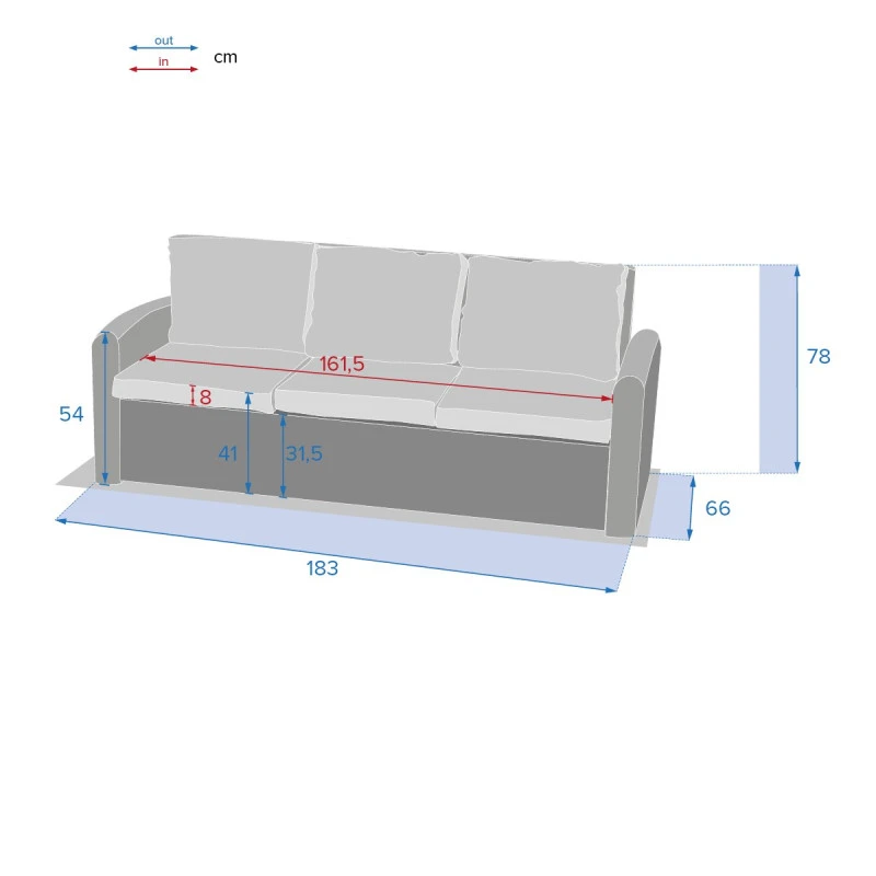Ce canapé est conçu spécialement pour l’extérieur : sa structure est en aluminium traité époxy antirouille, son habillage est en résine synthétique tressée et ses coussins sont en polyester 180 g/m² traités déperlant et déhoussables.
