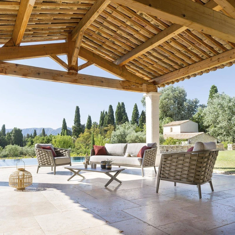 Complétez votre salon de jardin avec le canapé extérieur 3 places Embruns noisette / praline de marque Hespéride.