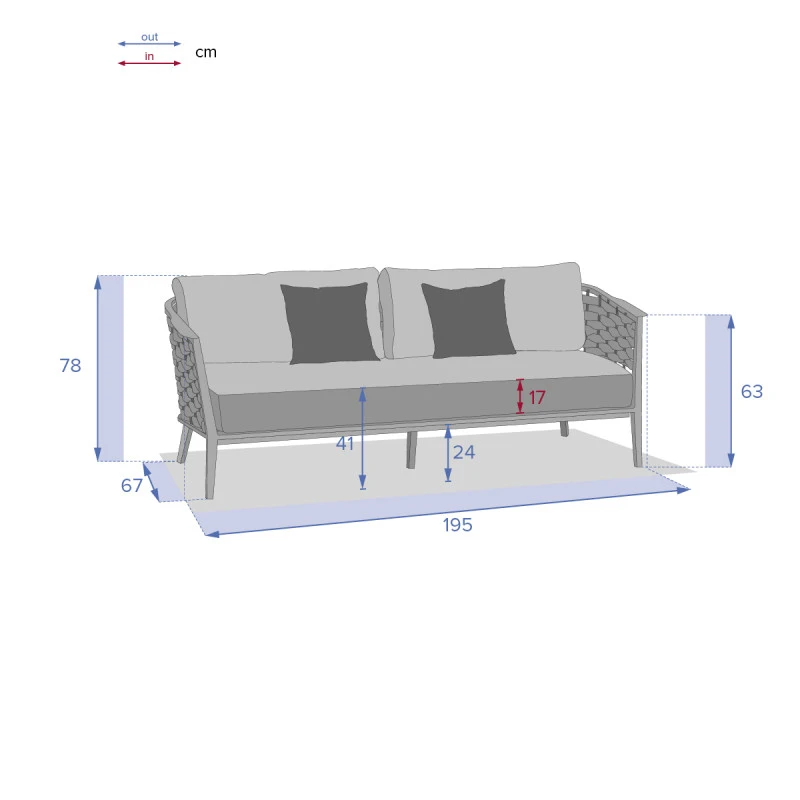 Conçu spécialement pour l’extérieur, la structure est en aluminium traité époxy antirouille et les coussins sont en polyester 240 g/m² traités déperlants.