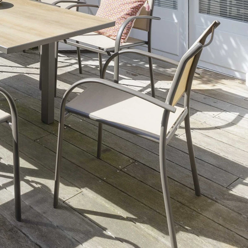 Pour des repas en plein air, installez vous confortablement dans un fauteuil extérieur Piazza en coloris lin structure tonka de la marque Hespéride.
