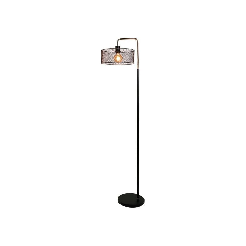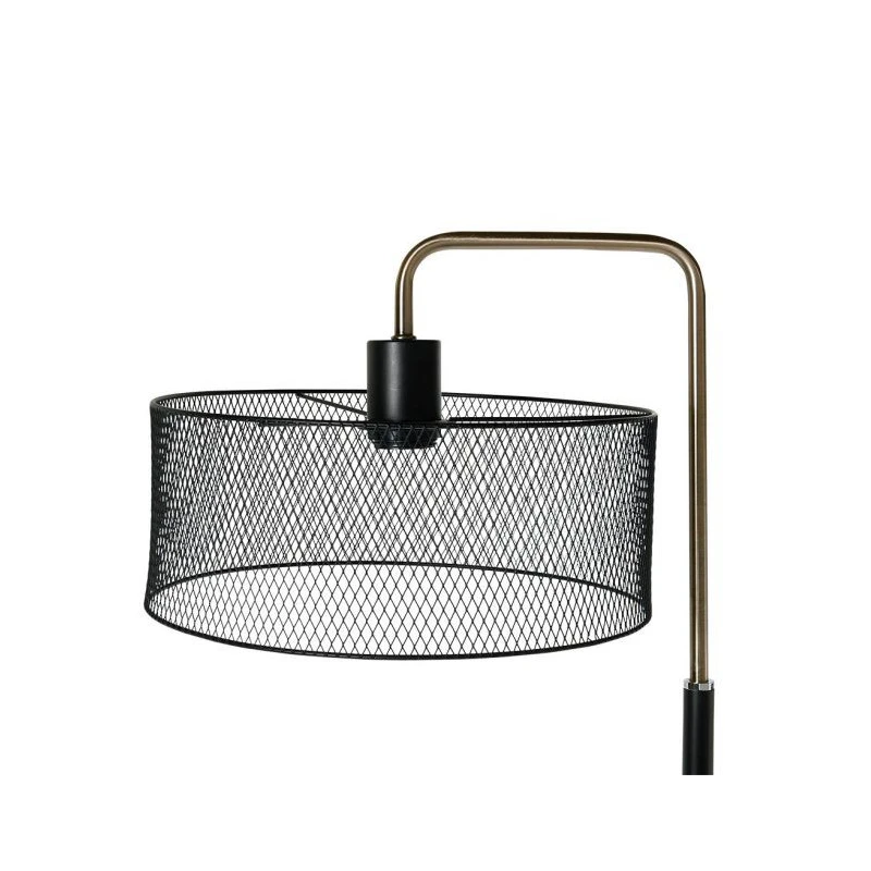 Lampadaire droit en métal noir et doré avec abat-jour en grillage de la marque Ostaria.